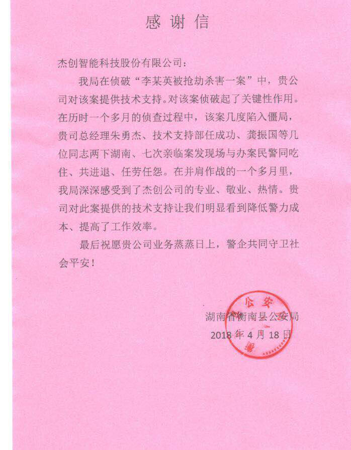 近日,湖南省衡南公安局发来感谢函,对开元体育智能在近期协助侦破“李某英被抢劫杀害一案”表示感谢,目前相关犯罪嫌疑人已被依法刑事拘留,案件正在进一步侦办中。